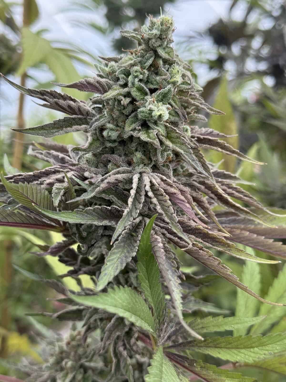 Expect most of the offspring to shine with the vivid lime-green look that both parents are famous for — eye-catching plants that light up the garden. Among them, a standout phenotype showed itself with striking fall colors not only in the leaves but carried into the sugar leaves and flower, giving the patch a unique seasonal beauty.